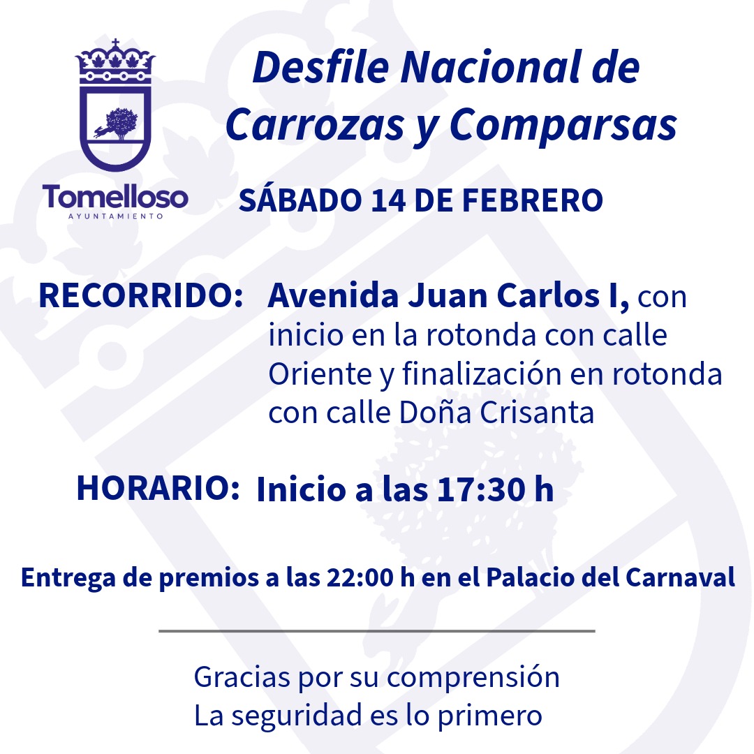 El Ayuntamiento ha emitido un comunicado en donde recuerda que el desfile Nacional de Carrozas y Comparsas, que se celebrará hoy sábado, 14 de febrero, ha cambiado su recorrido inicialmente previsto.