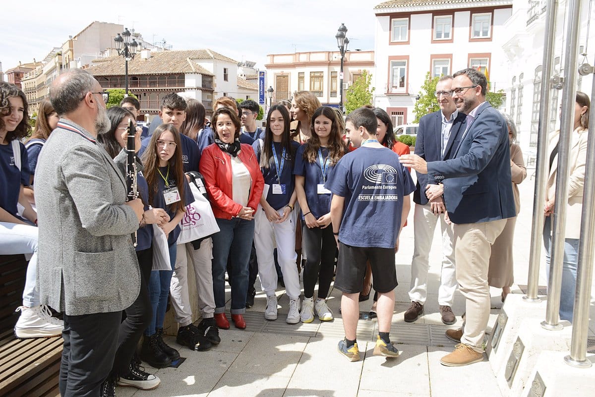 Estudiantes y profesores del IES García Pavón, integrantes del proyecto ‘Escuela Embajadora del Parlamento Europeo’, han participado activamente en la ceremonia, la cual ha culminado con el acto simbólico de izar la bandera de Europa en la Plaza de España. Este gesto representa el compromiso de la institución educativa y del municipio con los valores y principios europeos.