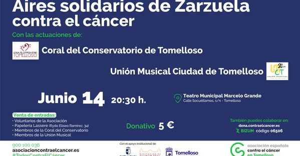 La Asociación Española Contra el Cáncer (AECC) ha organizado un festival de música en apoyo a la lucha contra el cáncer, en el que actuarán la Coral del Conservatorio Municipal y la Unión Musical “Ciudad de Tomelloso”. Este evento se llevará a cabo este sábado 14 de junio, a las 20:30 h. en el Teatro Municipal «Marcelo Grande».