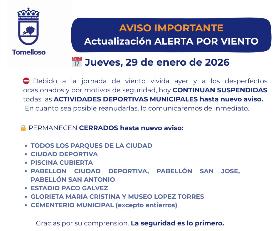 Las actividades deportivas municipales, instalaciones deportivas y espacios públicos al aire libre seguirán cerradas, incluyendo cementerio y museo López Torres, en la jornada de hoy jueves. Esta medida se toma con el objetivo de garantizar la seguridad, priorizando el bienestar de la comunidad.